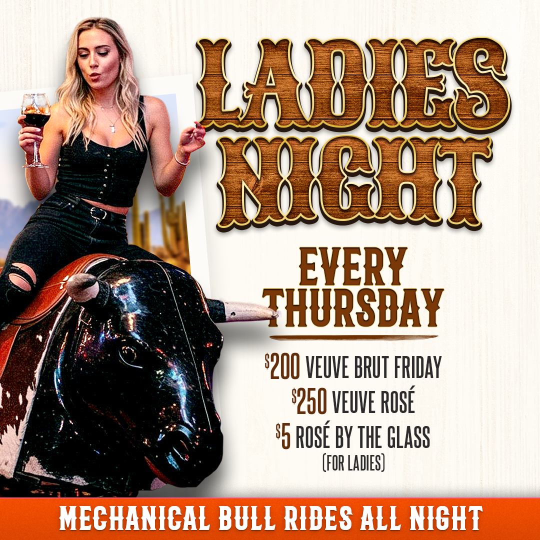 Ladies Night every Thursday! $200 Veuve Brut Friday | $250 Veuve Rose | $5 Rose by the glass (for ladies). Mechanical Bull rides all night!
