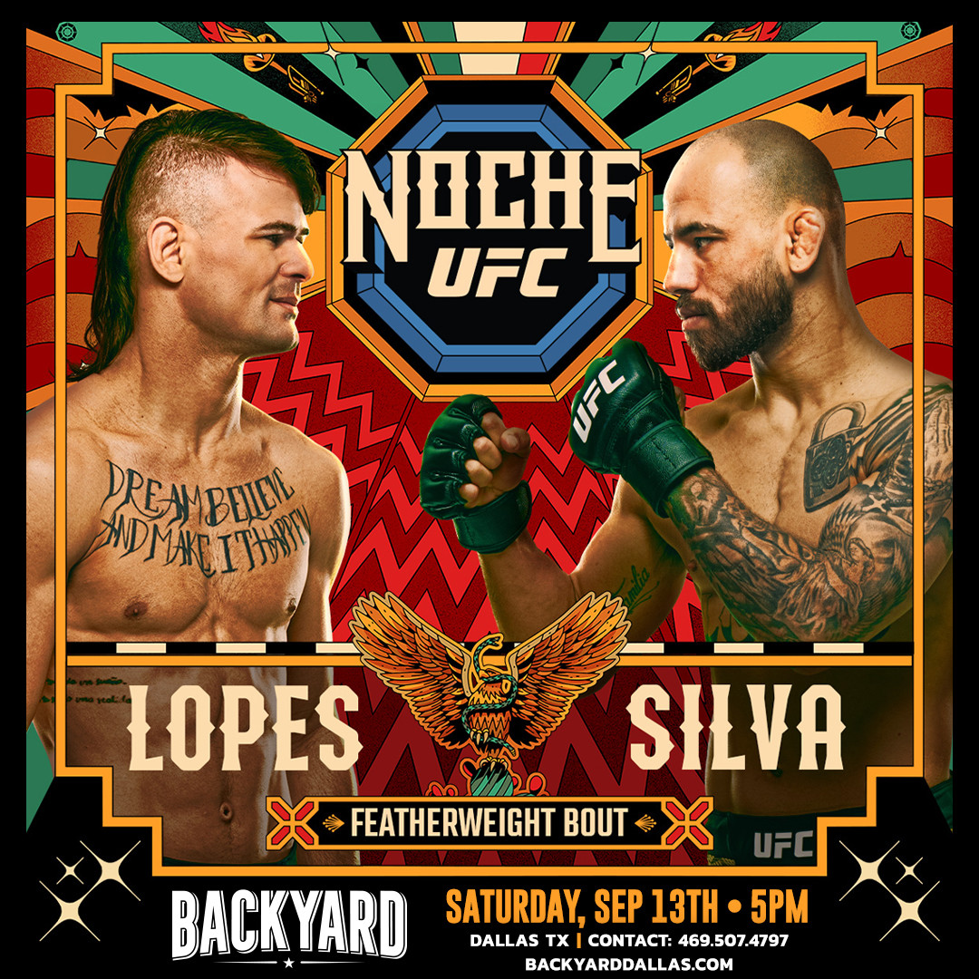 Catch all the action at Backyard Dallas as Lopes takes on Silva on September 13th at 5 PM! Join us for the fight, great drinks, and an awesome atmosphere—don't miss out!